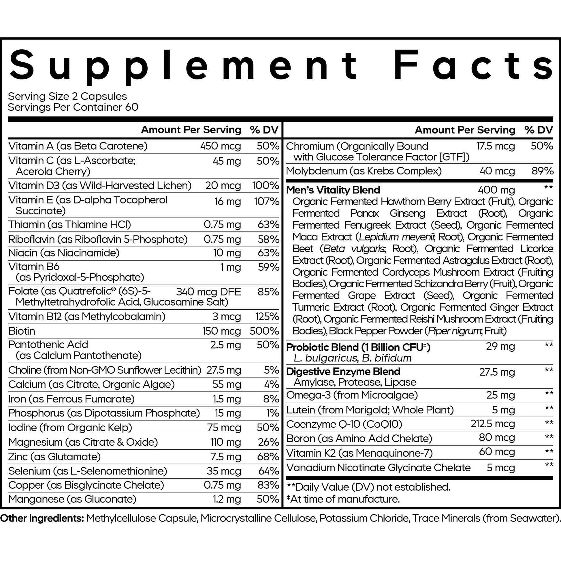 - These men's vitamins also feature probiotics, a digestive enzyme blend, organic turmeric, black pepper powder, and CoQ10 to elevate this formula further.